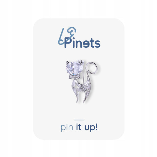 Kotek srebrny z kokardką - broszka z cyrkoniami