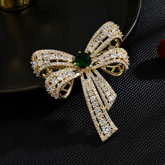 Kotek złoty z kokardką - broszka z cyrkoniami