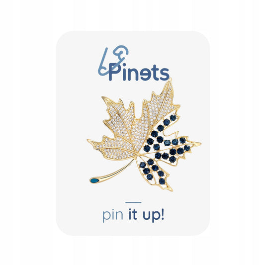 Broszka Liść pozłacany z białymi i niebieskimi cyrkoniami