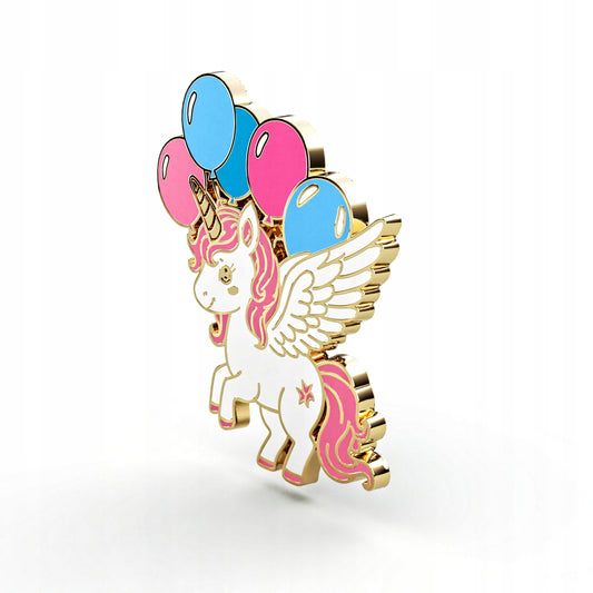 PINETS Złota przypinka Jednorożec z balonami i skrzydłami Różowo Niebieski