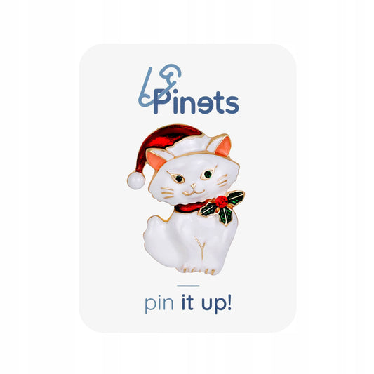 Świąteczny biały kotek z czapką Świętego Mikołaja - ozdobna broszka na święta