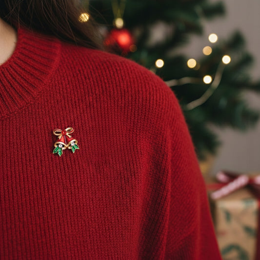 Świąteczna Broszka Dzwonki, Dzwoneczki - Czerwień, Złoto & Kryształki