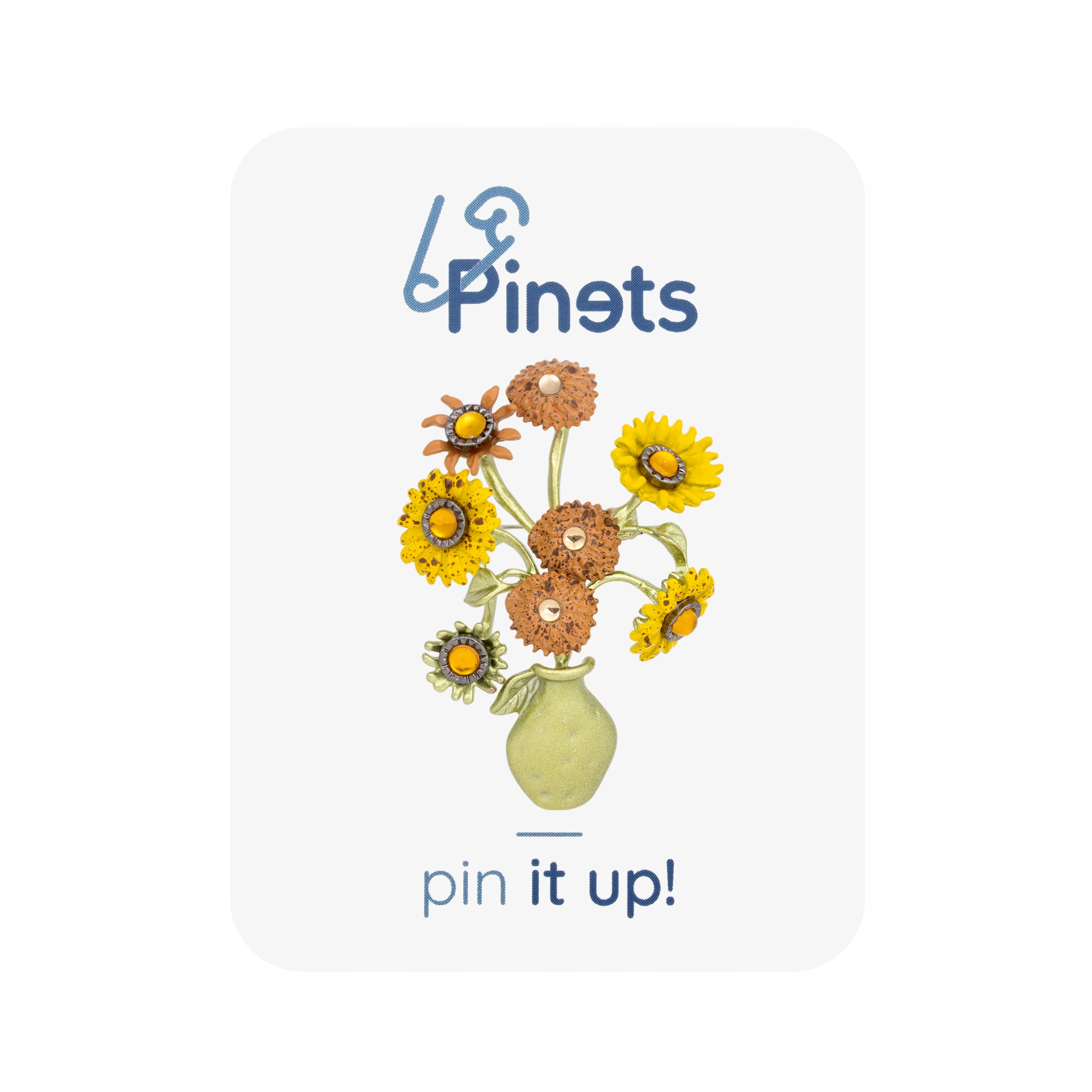 Dodaj swojemu stylowi wyjątkowego uroku dzięki broszce Pinets w kształcie bukietu słoneczników w zielonym wazonie. Ta oryginalna broszka została wykonana z dbałością o detale – kolorowe kwiaty w odcieniach żółci i pomarańczy ozdobione są drobnymi połyskującymi akcentami, które nadają całości subtelnego blasku.