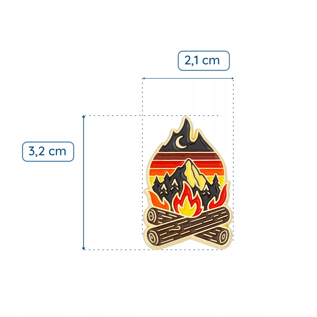 Ten starannie wykonany emaliowany pin łączy w sobie motyw gór, zachodu słońca i płomieni ogniska, tworząc symbol wolności, podróży i miłości do natury.