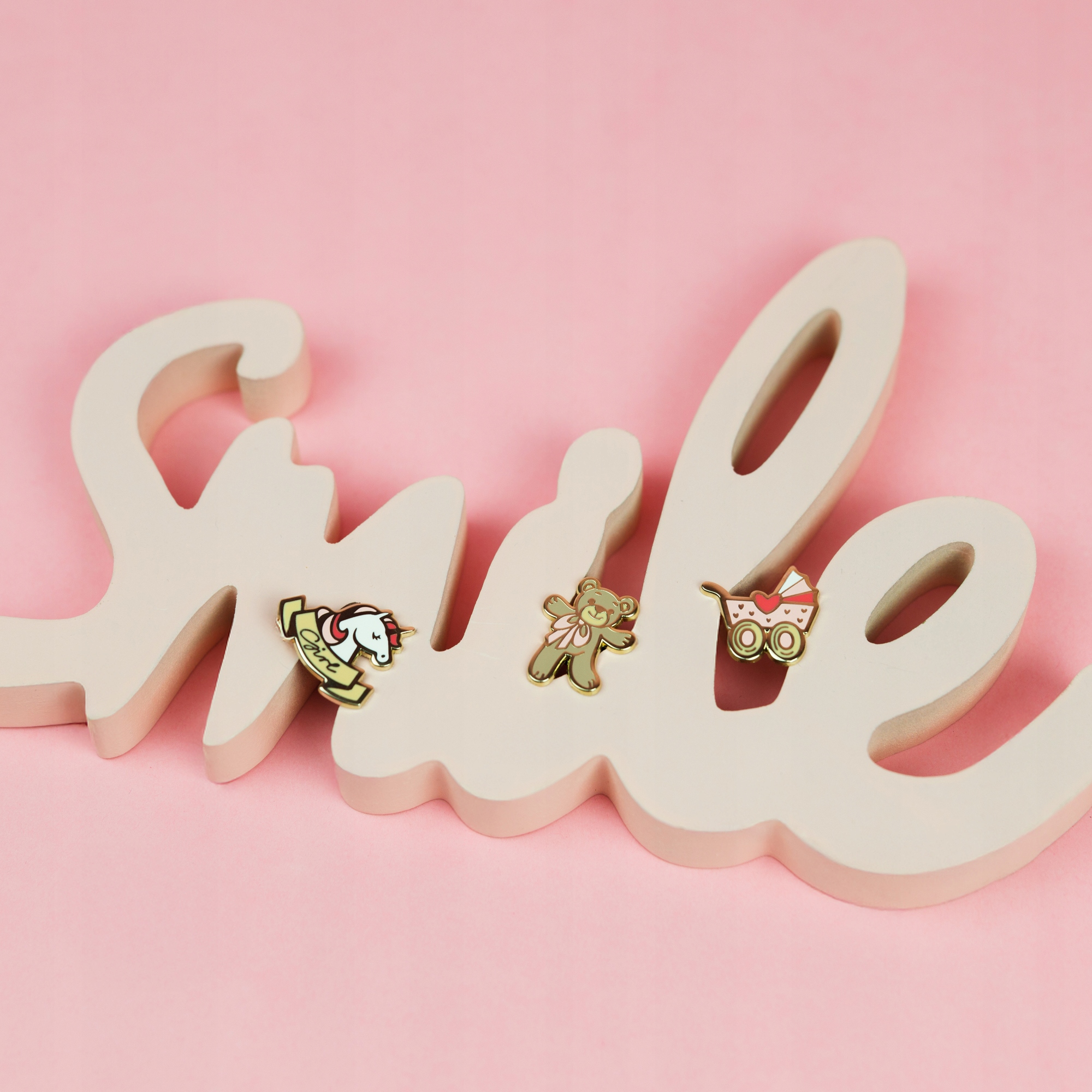 Przypinka z Wózkiem jest częścią kolekcji dziewczęcej, w której znajdziesz również misia i jednorożca!