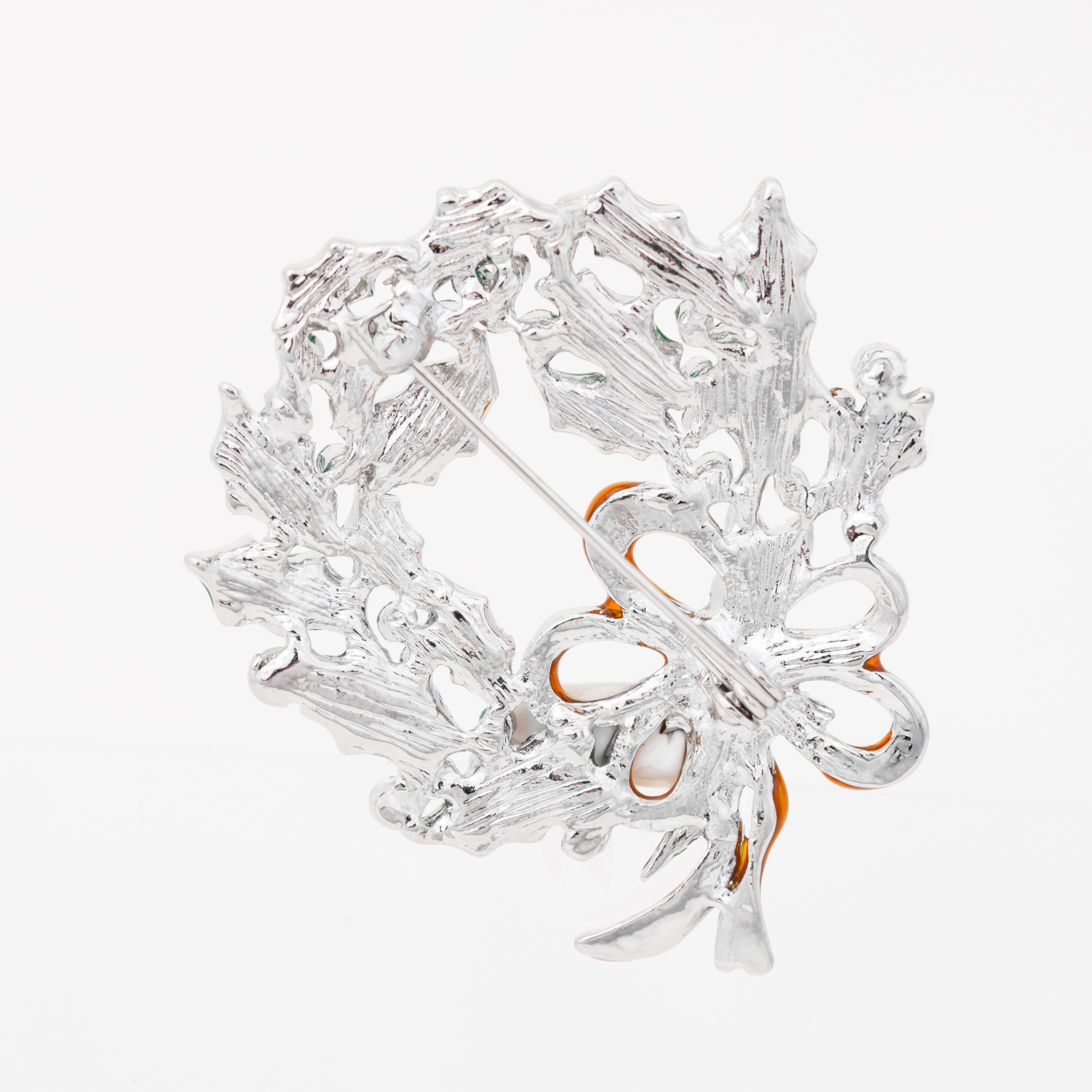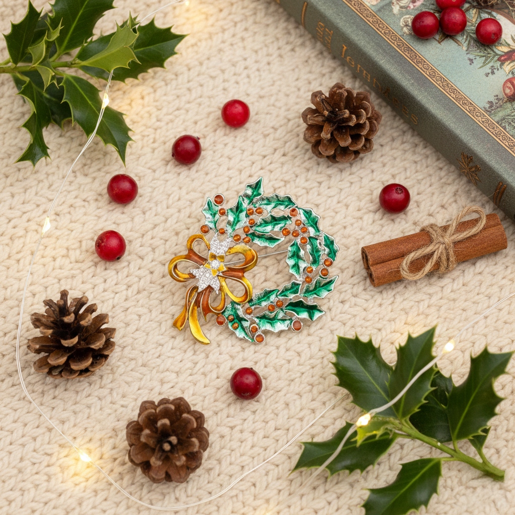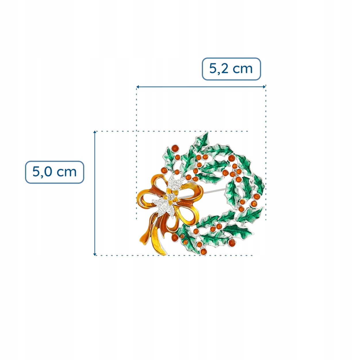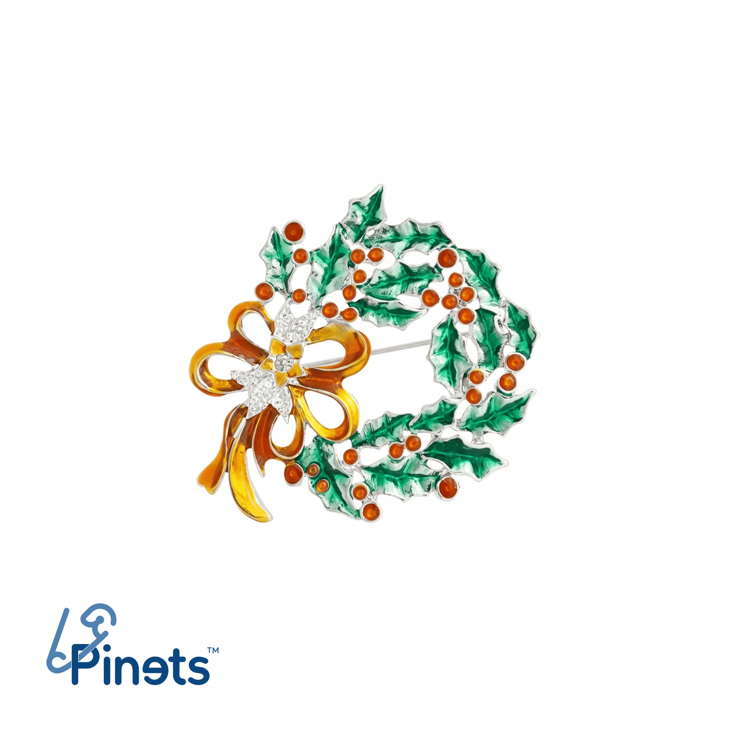 Broszka Pinets w kształcie bożonarodzeniowego wianka to efektowny i elegancki dodatek, który idealnie sprawdzi się w okresie zimowym i świątecznym. Pięknie prezentuje się przypięta do swetra, płaszcza, marynarki, szala lub czapki, a także jako ozdoba prezentu