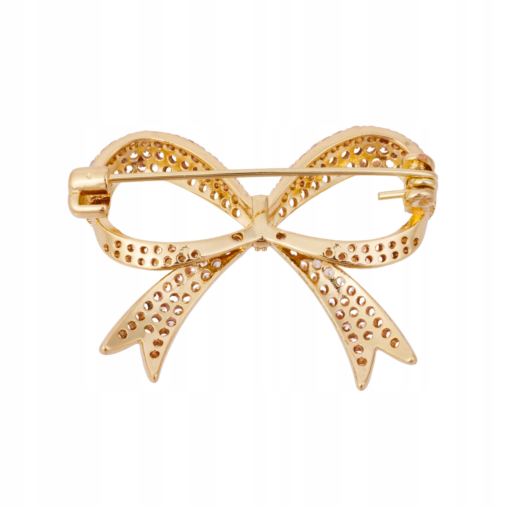 Stylowa i kobieca broszka w kształcie kokardy to idealny dodatek dla miłośniczek elegancji i subtelnego blasku. Wykonana z wysokiej jakości miedzi, pokrytej warstwą 18-karatowego złota, zachwyca swoim połyskiem i precyzyjnym wykonaniem. Całość ozdobiona została drobnymi, lśniącymi cyrkoniami, które pięknie odbijają światło, nadając biżuterii luksusowego charakteru.